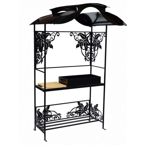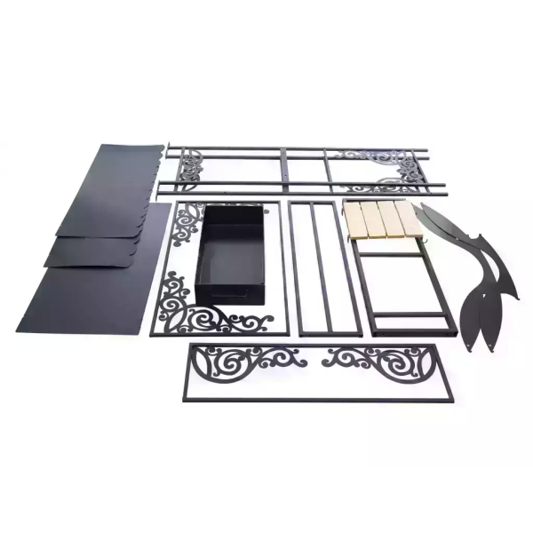 Схема сборки, крепежные болты, съёмный деревянный столик, полочка для дров, съёмная крыша , стойки, ящик