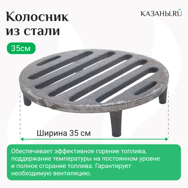Изделие изготовлено из надежной стали согласно строгим стандартам, которые предъявляются к печному литью. Срок службы колосника не ограничен конкретным периодом времени - элемент сохраняет свои характеристики на протяжении десятков лет при бережном обращении. Колосник с диаметром 35 см подходит для широких тандыров.