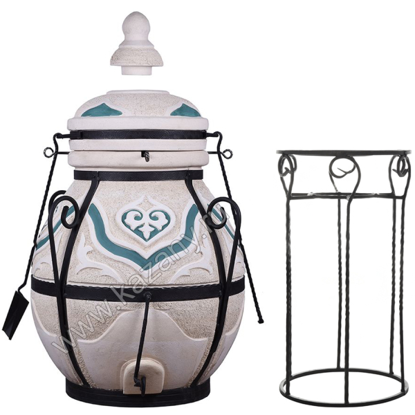 Жаровня укомплектована 12 шампурами, подставкой под крышку, аксессуаром для подвешивания шампуров, совком, чугунным колосником, кочергой. В комплекте также имеется подставка под тандыр. Поверхность печи украшена узорами, стенки с толщиной 8 см усилены металлическим кованым каркасом и ручками. В подставках предусмотрены красивые завитки.
