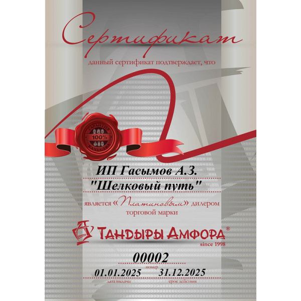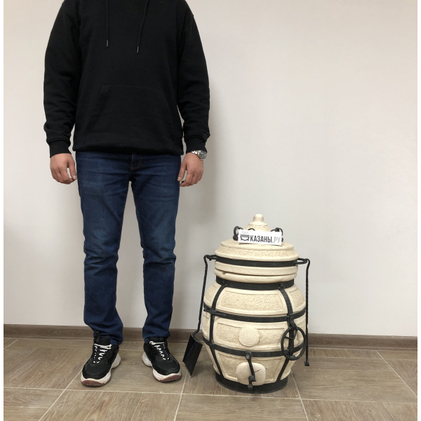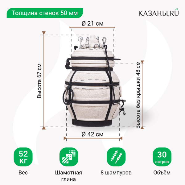 Тандыр небольшой - его высота с крышкой составляет 67 см, без крышки - 48 см. Диаметр жаровни - 42 см. При выборе некоторых комплектующих надо учитывать два параметра - глубину тандыра и диаметр горловины. Горловина этой модели печи - 21 см. Важно не перепутать с общим диаметром печи.