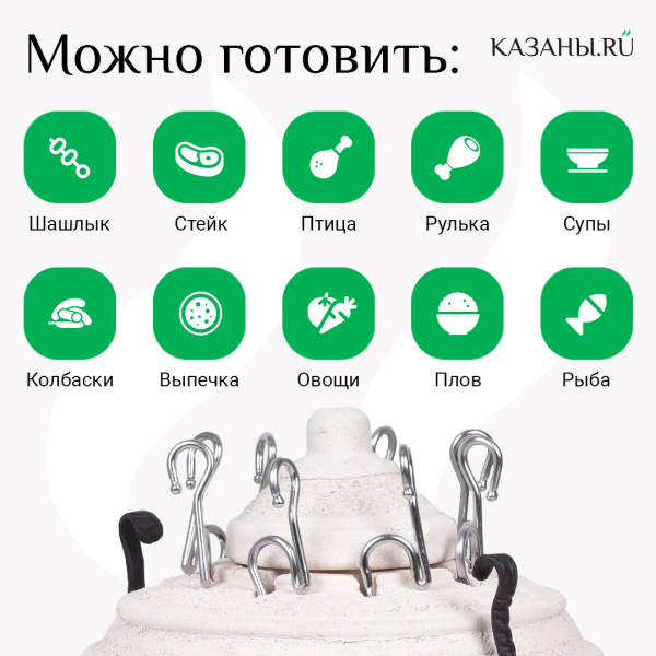 В комплекте с тандыром вы получаете чугунный колосник, 8 шампуров, кочергу и совок. Шампуры предназначены для шашлыка на небольшую компанию. Всегда есть возможность подобрать дополнительные аксессуары для приготовления более разнообразной еды. Для жаровни можно подобрать решетки, жароотсекатели, специальные камни и чугунки для приготовления еды в остывающей печи. Вариантов много, аксессуары расширяют ассортимент доступных блюд.
