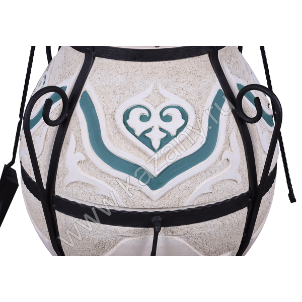 Жаровня укомплектована 12 шампурами, подставкой под крышку, аксессуаром для подвешивания шампуров, совком, чугунным колосником, кочергой. В комплекте также имеется подставка под тандыр. Поверхность печи украшена узорами, стенки с толщиной 8 см усилены металлическим кованым каркасом и ручками. В подставках предусмотрены красивые завитки.