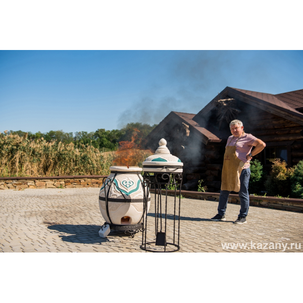 Жаровня укомплектована 12 шампурами, подставкой под крышку, аксессуаром для подвешивания шампуров, совком, чугунным колосником, кочергой. В комплекте также имеется подставка под тандыр. Поверхность печи украшена узорами, стенки с толщиной 8 см усилены металлическим кованым каркасом и ручками. В подставках предусмотрены красивые завитки.
