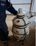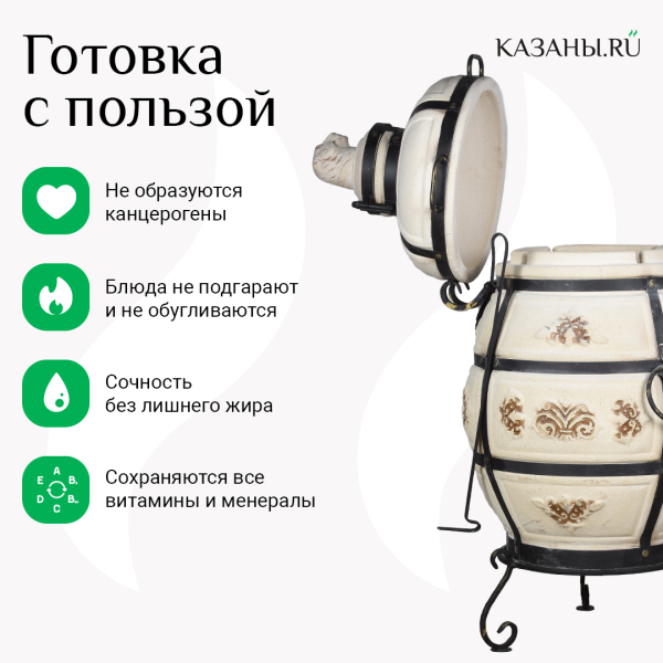 Высота печи с крышкой - 95 см, без крышки - 62 см. Диаметр жаровни составляет 56 см, горловины - 31 см. Толщина стенок - 5 см. В комплекте предлагается набор из 8 шампуров, подставка под тандыр, чугунный колосник, кочерга, совок. Модель весит около 100 кг, печь подходит для перевозки на природу. Она подойдет для безопасного пикника - в тандыре отсутствует источник открытого огня, пожар полностью исключен.